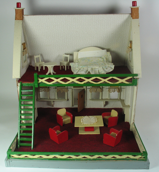 Poppenhuis met diverse accessoires waaronder; salontafel met vier fauteuils, volledig opgemaakt bed en een rond tafeltje met twee stoelen. Poppenhuis is een replica van een huis te Zwartewaal aan de Henry Fordstraat 23.