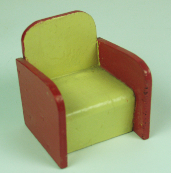 Stoel zijnde fauteuil, behorende bij poppenhuis. Fauteuil aan binnenzijde crème en buitenzijde rood.