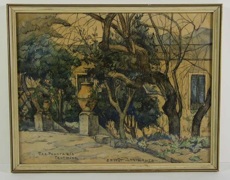 Tekening met voorstelling van een gebouw of (land)huis in de tinten grijsgroen. Op de voorgrond een gebouw verscholen achter enkele bomen. Op de achtergrond rechts gezicht op enkele bergen. Delen geschilderd met aquarelverf. Tekening in smalle, geprofileerde, beige lijst. Getiteld linksonder: 'San Pancrazio, Toarmina (Sicilië, Italië). Gesigneerd middenonder.