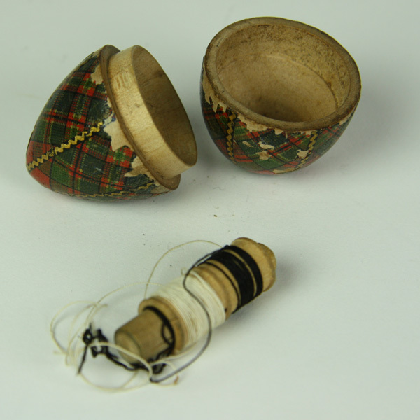 Eivormig doosje voorzien van Schotse ruit.