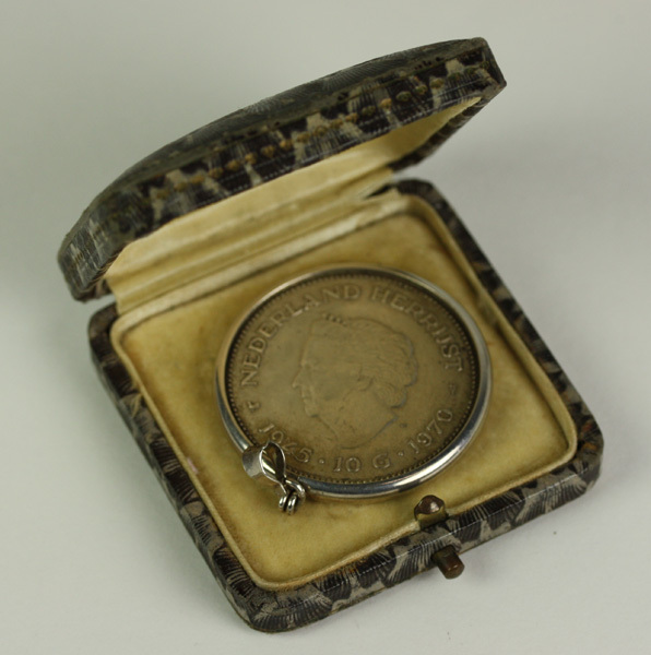 Hanger van tien gulden met daarop koningin Juliana. In bijbehorende gemarmerde doos.