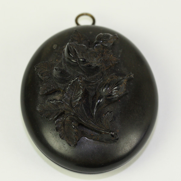 Medaillon, zwart, buitenzijde versierd met een uitgesneden roos. Binnenzijde links voorzien van zwart/wit foto met daarop een vrouw. Binnenzijde rechts voorzien van een haarlok bijeengehouden door een roze lintje. Onder haarlok opschrift op blauw papier.
