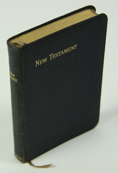 Bijbel, bestaande uit het nieuwe testament in het Engels gedrukt. Blauwe kaft met goudkleurige opschrift. Bladsnedes voorzien van bladgoud
