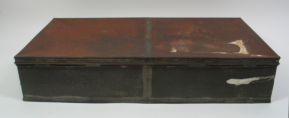 Metalen kist, bestaande uit vermoedelijk twee (koek)blikken die aan elkaar gelast zijn. Kist voorzien van twee sluitingen en een hangslot. In de kist zit een niet bijpassende sluiten.