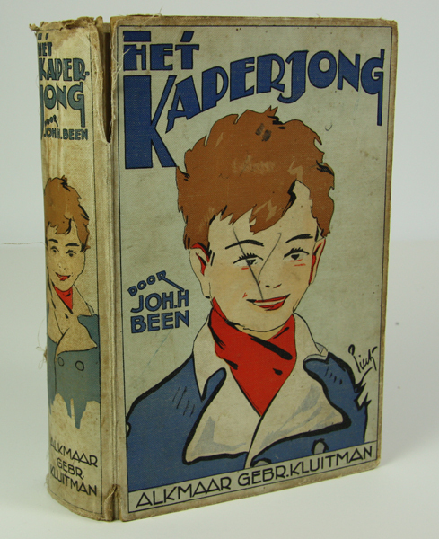 Gebonden jeugdboek met harde kaft getiteld: 'Het Kaperjong'. Op de voorzijde een afbeelding van een jongen.