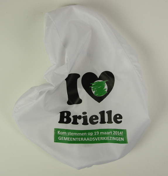 Fietszadelhoes, wit met zwarte en witte letters en met groen accent. Hoes vervaardigd ter gelegenheid voor het promoten van de gemeenteraadsverkiezingen van 19 maart 2014.
