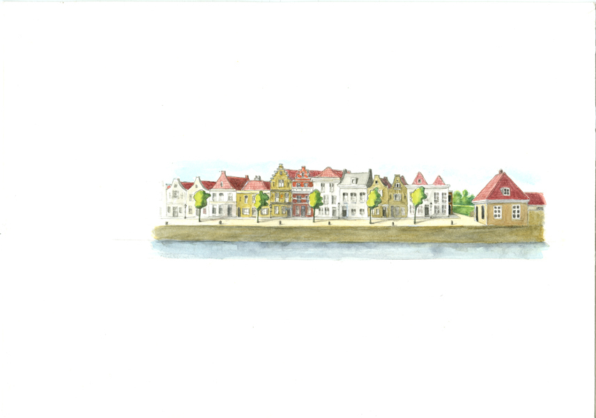 Aquarel met gezicht op de kade en huizen van Maarland Noordzijde. Geheel rechts het Poortwachtershuisje. Niet gesigneerd en gedateerd.