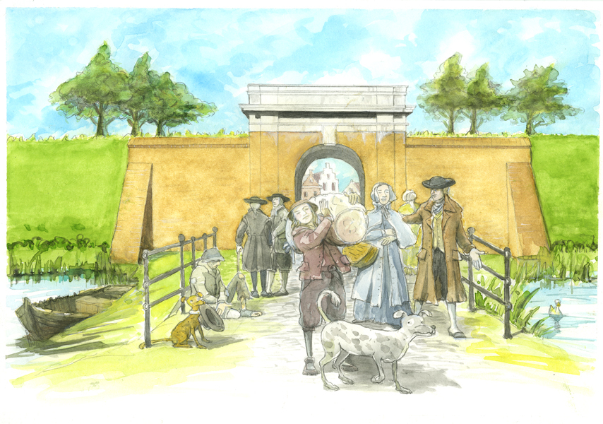 Aquarel met gezicht op de Kaaipoort. Op de achtergrond de poort met zicht op enkele huizen van de Kaaistraat. Op de voorgrond diverse figuren die de stad in en uit lopen. Aquarel niet gesigneerd en gedateerd.