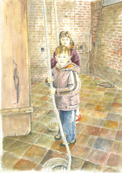 Aquarel met twee kinderen in de klokkenzolder van de Sint Catharijnekerk. Op de voorgrond een jongen en daarachter een meisje. Beide kinderen hebben een touw vast in hun handen. Aquarel niet gesigneerd en gedateerd.
