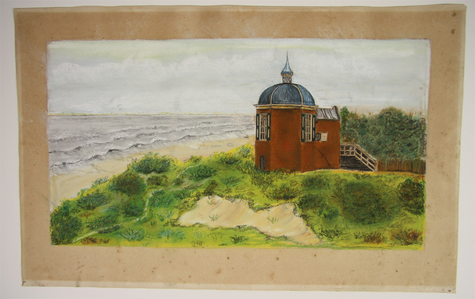 Tekening, pastel, met gezicht op Koepel Zeeburg in Oostvoorrne. Op de voorgond rechts gezicht op de Koepel Zeeburg in de duinen van Oostvoorne. Links op de achtergrond het strand en de zee van Oostvoorne. Gesigneerd rechtsonder.