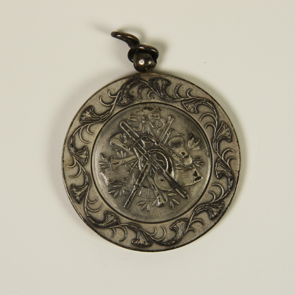 Medaille, zilverkleurig, met op de voorkant een medaillon met daarin voorstelling van diverse blaasinstrumenten in kader van florale motieven. Achterkant voorzien van inscriptie: 'ALS DANK VAN: '' BENVENUTO" 5 MEI 1960. Medaille voorzien van ophangoog.