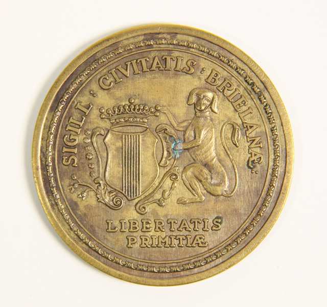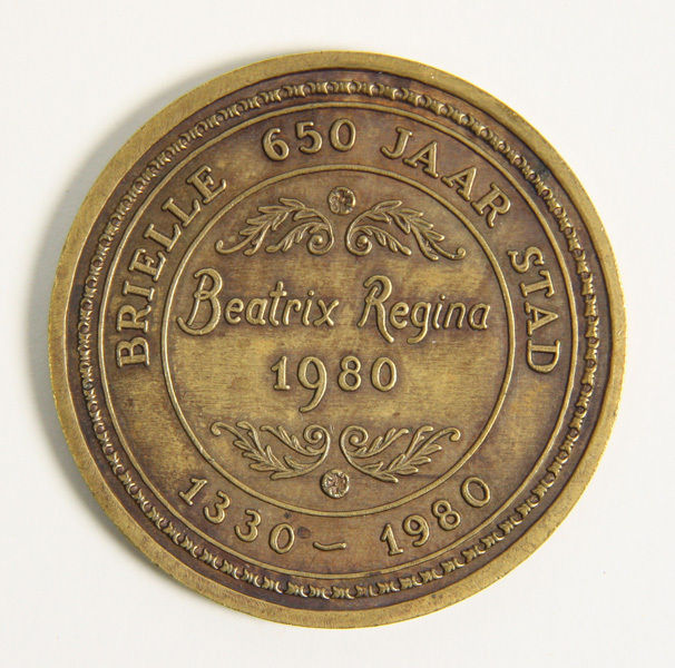 Gedenkpenning met opschrift: Brielle 650 jaar stad 1330-1980 en Beatrix Regina 1980. Op de keerzijde het wapen van Brielle, gehouden door een capirussa, met opschrift: SIGILL CIVITATIS BRIELANAE en LIBERTATIS PRIMITIAE.