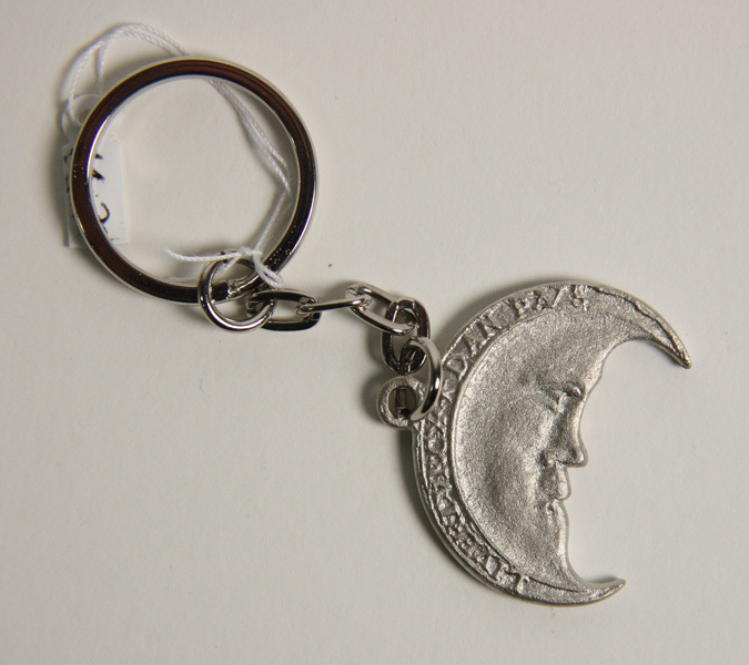 Prototype van sleutelhanger voor verkoop in de museumwinkel, vanaf 2012. Sleutelhanger in de vorm van geuzenpenning: een halve maan met gezicht en half rond opschrift. Sleutelring is rond.