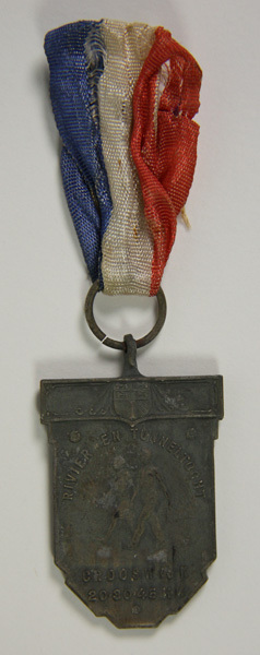 Metalen gedenkpenning met rood-wit-blauw lint. Op de voorzijde een afbeelding van een wandelende man en vrouw en de opschriften: RIVIER- EN TUNNELTOCHT CROOSWIJK 20-30-45 KM.
