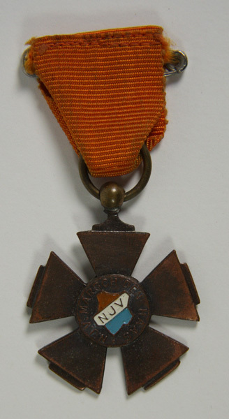 Metalen gedenkpenning in de vorm van een vijfarmig kruis met opschrift: NJV. Aan het oog een oranje lint met speldje.