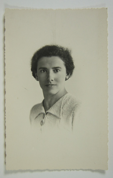 Portret van jonge vrouw. Foto heeft een gekartelde rand.