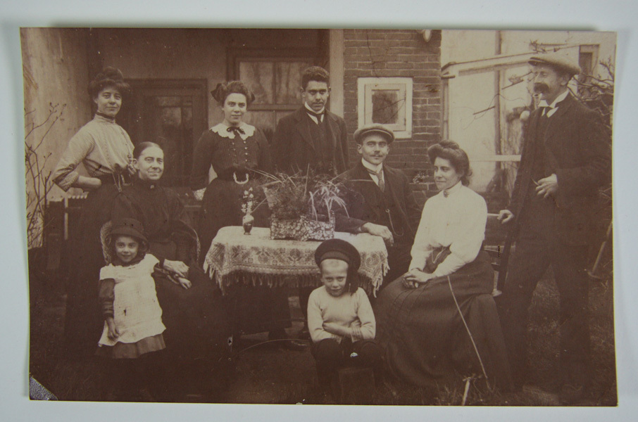 Familieportret van vier vrouwen, drie mannen, een jongen en een meisje. Foto is genomen achter het huis Slagveld 49.