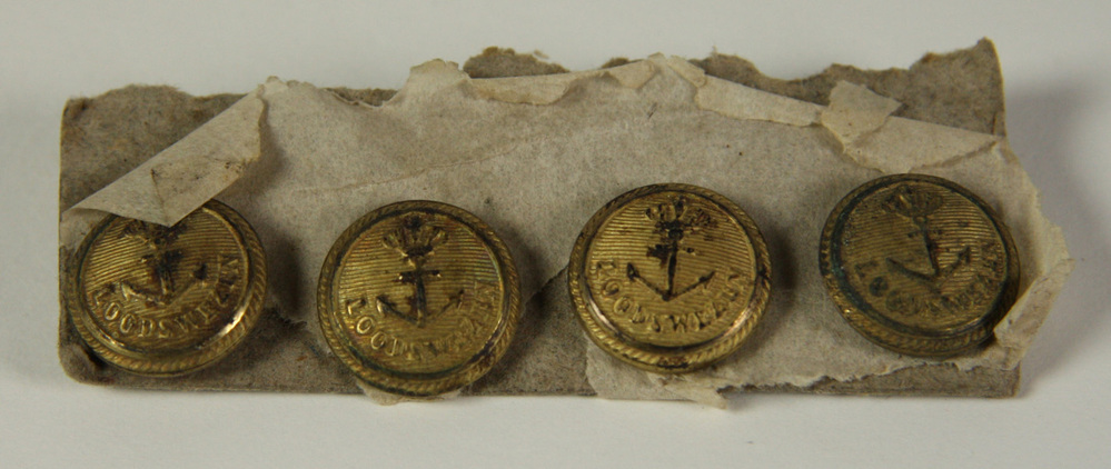 Vier knopen van het uniform van het Loodswezen. Knopen zitten aan een kartonnetje. Op de knopen een afbeelding van een anker onder een kroon, en het opschrift LOODSWEZEN.