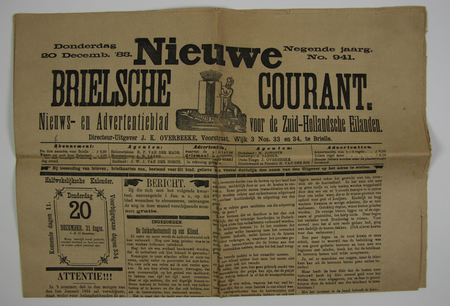Nieuwe Brielsche Courant, donderdag 20 December 1883. Onder het kopje 'laatste berichten' een artikel nav het vergaan van kotter no 12.