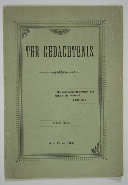 Boekje 'Ter gedachtenis', met blauwgrijze kaft. Op het schutblad: Aan Margaretha Smith, ter gelegenheid van de aanneming tot lidmaat der gemeente. Tussen de kaft en het schutblad een zelfgevouwen bladwijzer, met daarop het opschrift: A. Vrij febr '96