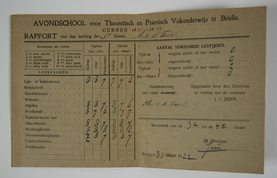 Schoolrapport van de Avondschool van A. van der Veer, 1921-22. Rapport gedrukt op grijsbruin karton. In het midden gevouwen.