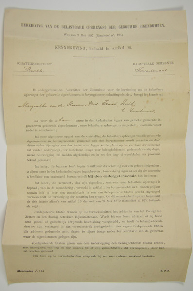 Overheidsdocument, betreft de herziening van belastbare opbrengst van onroerende goederen op naam van mevr. Margaretha van der Hoeven te Zwartewaal.
