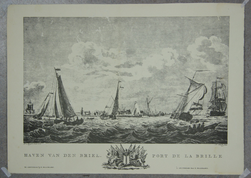 Afbeelding van de haven van Den Briel. Op de voorgrond diverse zeil- en roeiboten. Op de achtergrond de havenmond, de Catharijnekerk en molen 't Vliegend Hert.