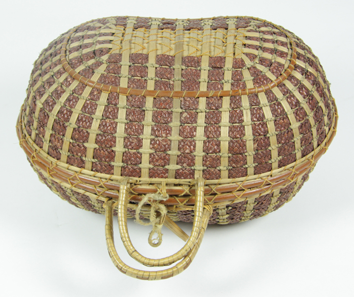 Ovale gevlochten mand in kleuren bruin,beige en aubergine. Sluiting door middel van een pin en touwtjes. Mand voorzien van twee handvatten.