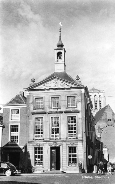 Ansichtkaart en foto, zwart/wit, getiteld 'Brielle, Stadhuis'. Op de voorgrond de Markt met het stadhuis van Brielle. Voor het stadhuis enkele mensen met links een auto. Op de achtergrond de Sint Catharijnekerk. Achterkant onbeschreven.