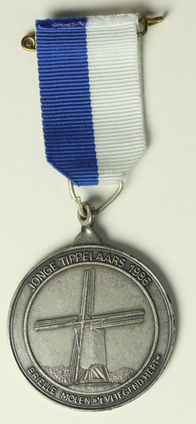 Ronde medaille waarop de molen 't Vliegend Hert in Brielle staat afgebeeld met rondom de tekst: JONGE TIPPELAARS 1986 BRIELLE MOLEN "t VLIEGEND HERT". Aan medaille een blauw/wit lint met speld.