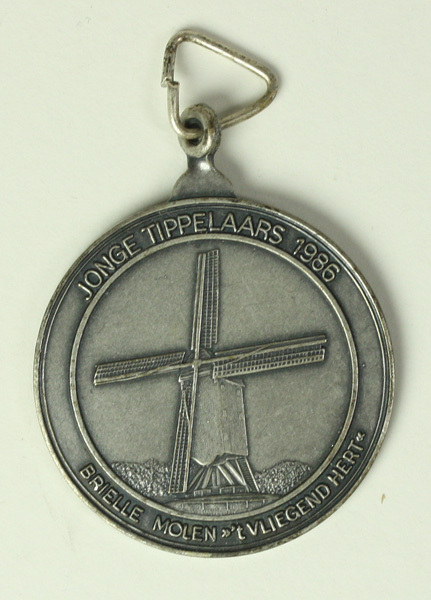 Ronde medaille waarop de molen 't Vliegend Hert in Brielle staat afgebeeld met rondom de tekst: JONGE TIPPELAARS 1986 BRIELLE MOLEN "t VLIEGEND HERT". Aan medaille een oog met haakje. Medaille zonder lint.
