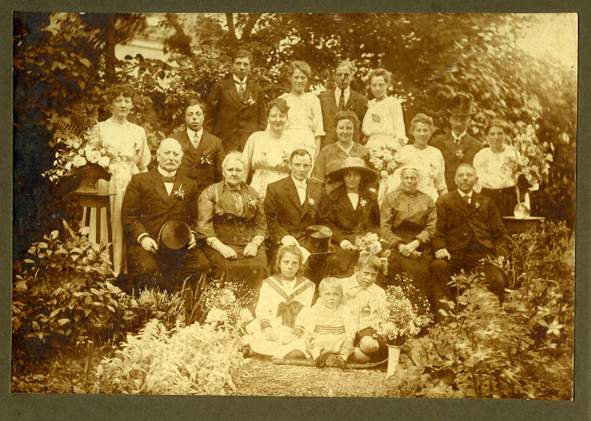 Foto, sepia, van familie Moerman. Foto vanuit een tuin gemaakt. Tussen de personen staan diverse bloemstukken. Diverse personen dragen een corsage. Foto op grijs karton geplakt en voorzien van een geprofileerd randje.