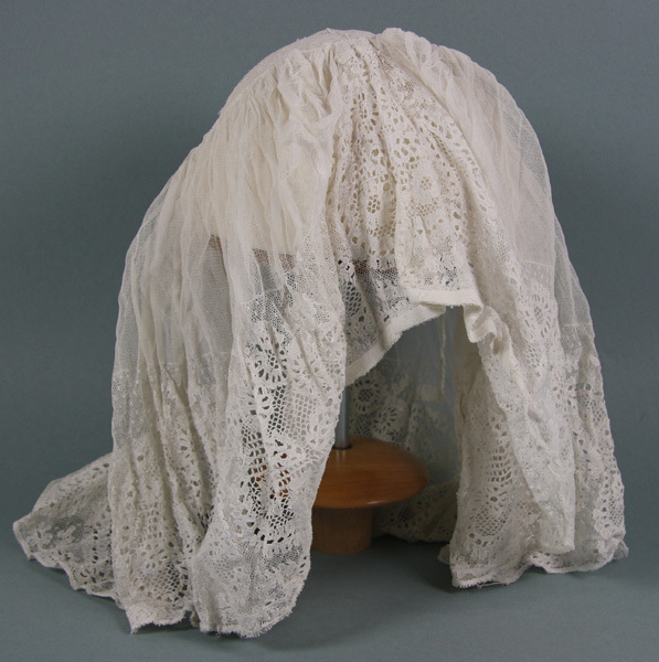 Muts, keuvel met een brede kantstrook van grote bloemen. De tule in het midden is met een veterband aan de bol bevestigd.