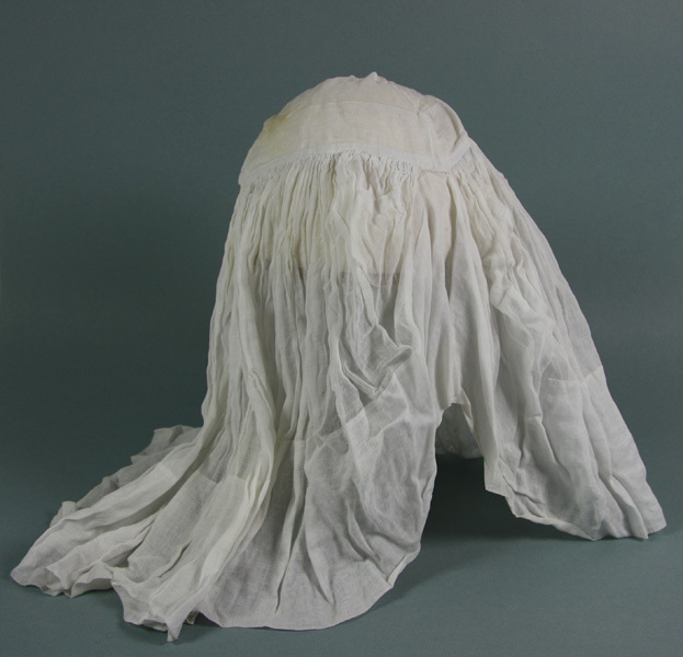 Muts, keuvel. Het achterdeel van de keuvel is met een veterband aan de bol bevestigd. De strook aan de onderzijde is gemaakt van een dubbele laag katoen. Het midden- en achterstuk van de muts is geplooid. Deze keuvel werd gebruikt tijdens de rouw.