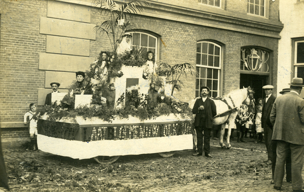 Ansichtkaart en foto, zwart/wit, gemaakt vermoedelijk gemaakt tijdens één van de vele optochten van de Brielse Floraliavereniging.