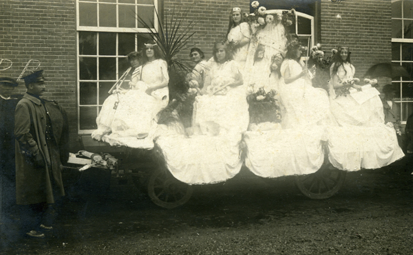 Ansichtkaart en foto, zwart/wit, gemaakt tijdens één van de vele optochten van de Brielse Floraliavereniging.