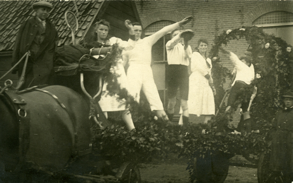 Ansichtkaart en foto, zwart/wit, gemaakt tijdens één van de vele optochten van de Brielse Floraliavereniging.