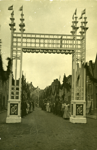 Ansichtkaart en foto, zwart/wit, gemaakt tijdens het onafhankelijkheidsfeest op 1 december 1913 te Brielle. Op de voorgrond de Langestraat versierd met slingers, poorten en guirlandes. Langs de kanten staan mensen op straat.