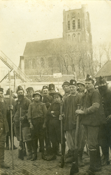 Ansichtkaart en foto, zwart/wit, gemaakt tijdens het 1 aprilfeest in 1922 te Brielle. Op de voorgrond een groep geuzen met op de achtergrond de Sint Catharijnekerk.