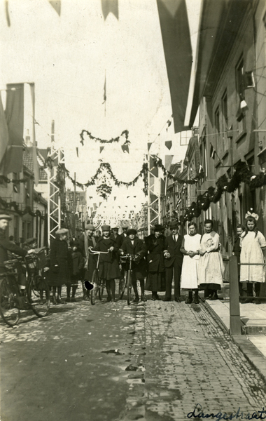 Ansichtkaart en foto, zwart/wit, gemaakt tijdens het 1 aprilfeest in 1922 te Brielle. Op de voorgrond de Langestraat met een groep mensen op straat. De Langestraat is versierd met poorten, quirlandes en vlaggen. Achterkant is beschreven.