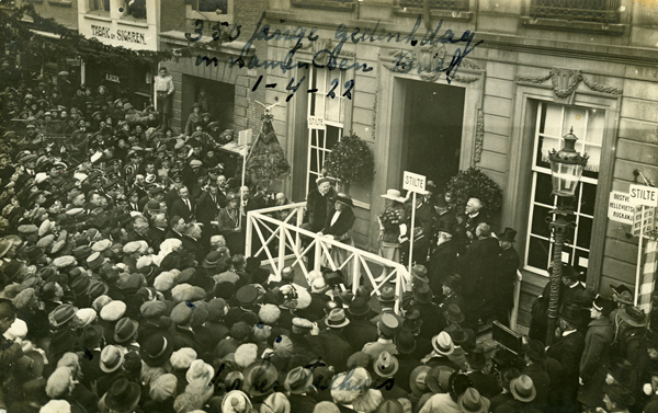 Ansichtkaart en foto, zwart/wit, gemaakt tijdens het 1 aprilfeest in 1922 te Brielle. Op de achtergrond de koninklijke familie op het bordes van het stadhuis, waar koningin Wilhelmina een toespraak houdt.