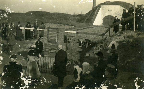 Ansichtkaart en foto, zwart/wit, gemaakt tijdens het 1 aprilfeest in 1922 te Brielle. Koningin Wilhelmina en koningin-moeder Emma bij het 1 april-monument, dat door koningin Wilhelmina werd onthuld.