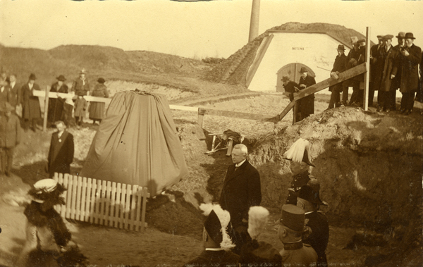 Ansichtkaart en foto, sepia, gemaakt tijdens het 1 aprilfeest in 1922 te Brielle. Koningin Wilhelmina bij het 1 april-monument, dat door haar wordt onthuld. Foto heeft een geschulpte rand.