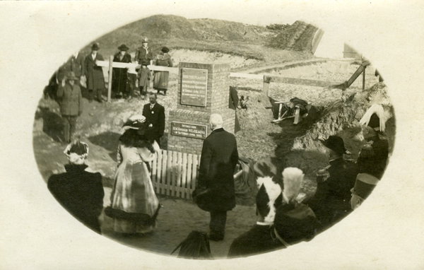 Ansichtkaart en foto, zwart/wit, gemaakt tijdens het 1 aprilfeest in 1922 te Brielle. Koningin Wilhelmina en koningin-moeder Emma bij het 1 april-monument, dat door koningin Wilhelmina werd onthuld. Foto in ovaal.