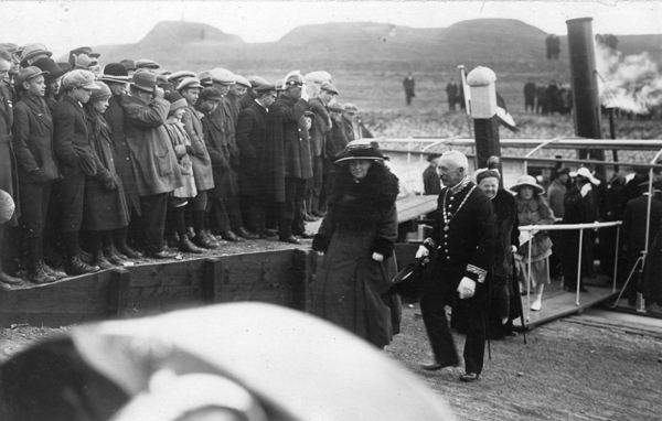 Ansichtkaart en foto, zwart/wit, gemaakt tijdens het 1 aprilfeest in 1922 te Brielle. Aankomst van de koninklijke familie.