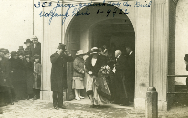 Ansichtkaart en foto, zwart/wit, gemaakt tijdens het 1 aprilfeest in 1922 te Brielle. De koninklijke familie verlaat de Sint Catharijnekerk.