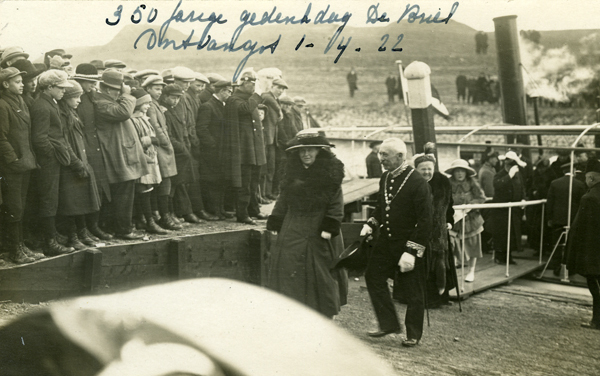 Ansichtkaart en foto, zwart/wit, gemaakt tijdens het 1 aprilfeest in 1922 te Brielle. Aankomst koninklijke familie op het Havenhoofd. Begroeting door Burgemeester F.J.D.C. Egter van Wissekerke. Op de looplank koningin-moeder Emma en prinses Juliana. Bron: Streekarchief VPR.