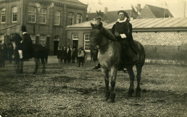 Ansichtkaart en foto, zwart/wit, gemaakt tijdens het 1 aprilfeest in 1922 te Brielle. Foto van deelnemers aan het historisch toneelstuk.
