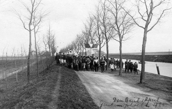 Ansichtkaart en foto, zwart/wit, gemaakt tijdens het 1 aprilfeest in 1922 te Brielle. Foto gemaakt tijdens het opvoeren van een historisch toneelstuk. Geuzen naderen Brielle via de Veerweg.