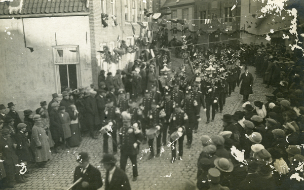 Ansichtkaart en foto, zwart/wit, gemaakt tijdens het 1 aprilfeest in 1922 te Brielle. Foto van de optocht door de Koopmanstraat richting de Langestraat.
